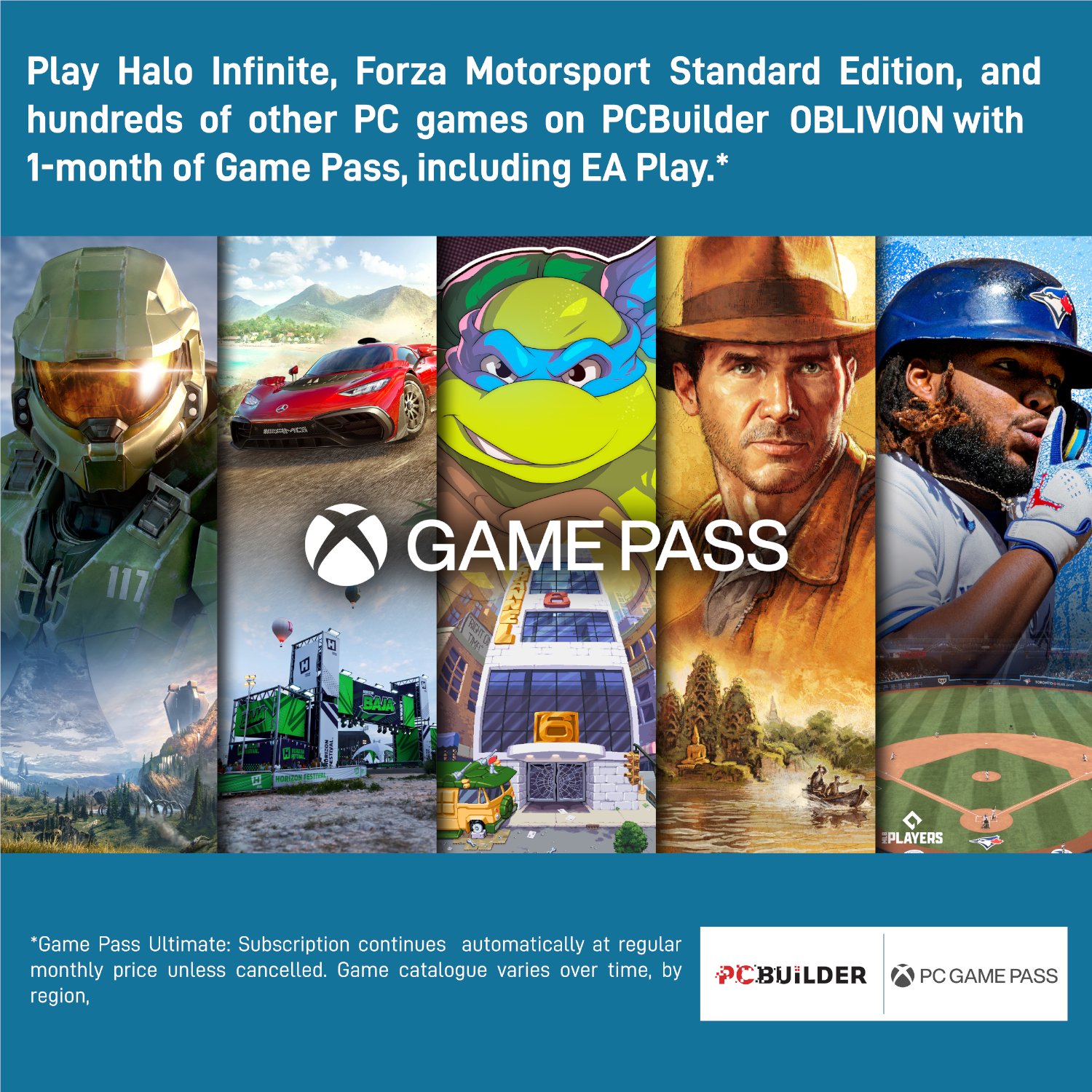 - Play over 100 high-quality PC games like Halo Infinite, Forza Horizon 5 and Teenage Mutant Ninja Turtles: Shredder’s Revenge with your new build and one month of PC Game Pass including EA Play. With new games being added all the time, there’s always something new to play from day one.