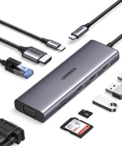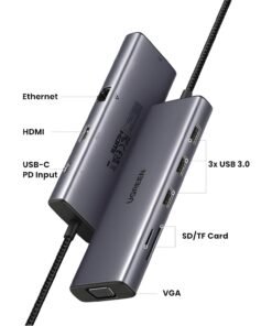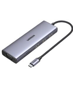 The UGREEN 9-in-1 Type-C Hub is a powerful and versatile expansion solution designed to enhance connectivity for laptops, tablets, and smartphones with Type-C ports. Featuring three USB 3.0 ports, 4K HDMI, VGA, RJ45 Gigabit Ethernet, SD and TF card slots, and a 100W Power Delivery (PD) charging port, this all-in-one hub provides fast data transfer, high-resolution display support, fast internet access, and efficient power management, all in a sleek, premium aluminium casing.