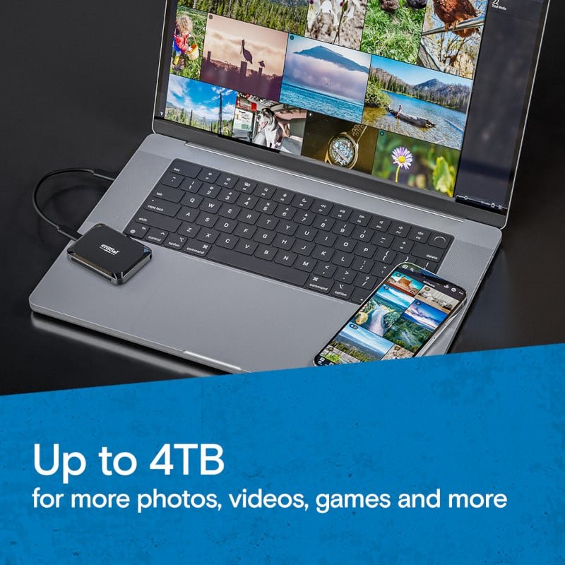 The Crucial® X9 Portable SSD provides dependable storage for your favourite devices wherever you go. The Crucial X9 is up to 7.5x faster than portable hard drives and compatible with PCs, Macs, tablets, gaming consoles, AndroidTM phones, and more, with file transfers of up to 1,050MB/s1 and up to 4TB2 of storage for all your favourite photos, videos, games, and more.